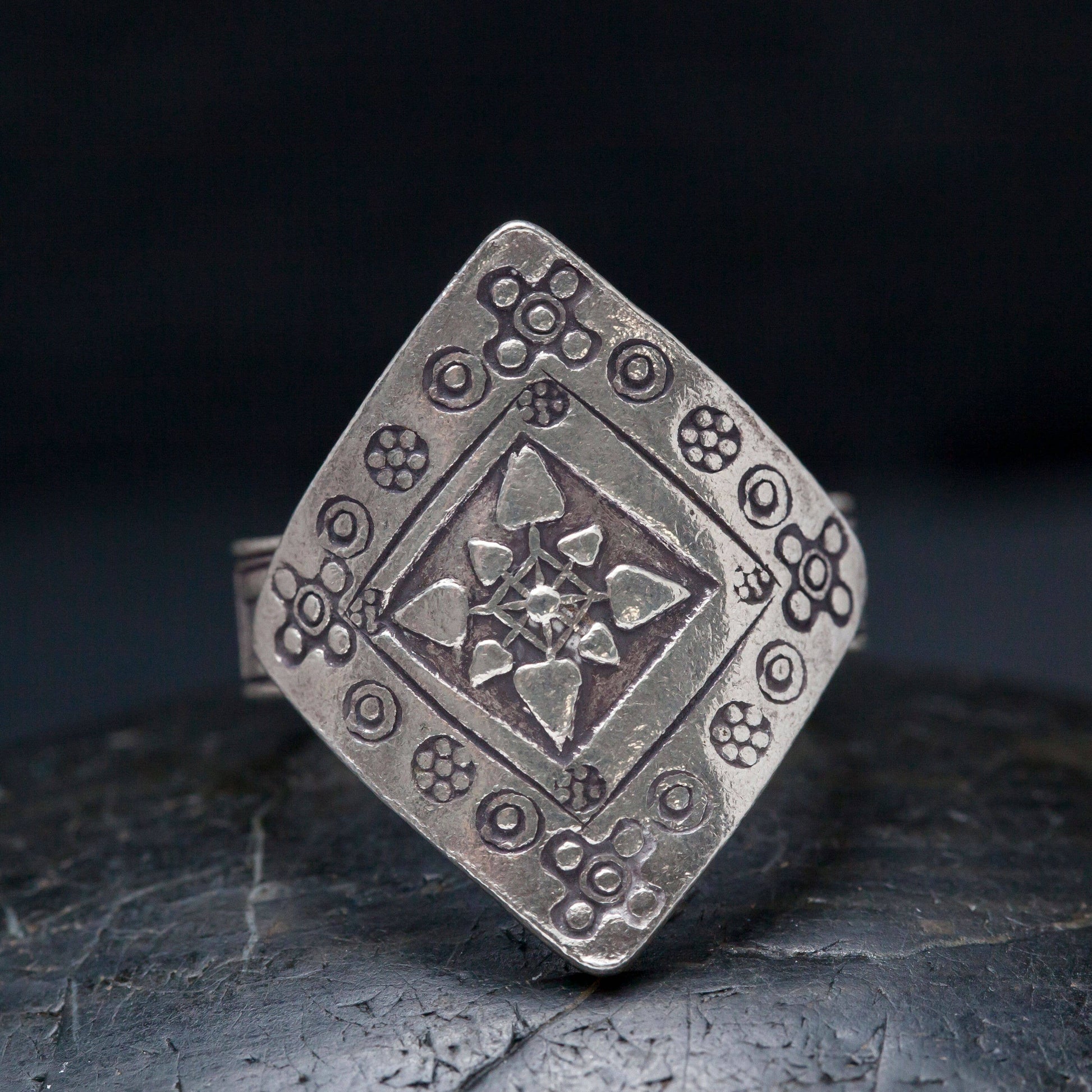 Handcrafted in Northern Thailand, this sterling silver ring carries both strength and soul. Each symbol is hand-stamped in pure silver — a testament to heritage craftsmanship and timeless beauty. With its pointed, diamond-shaped face and organic texture, this piece embodies the spirit of a faithful warrior — bold, grounded, and gracefully strong.